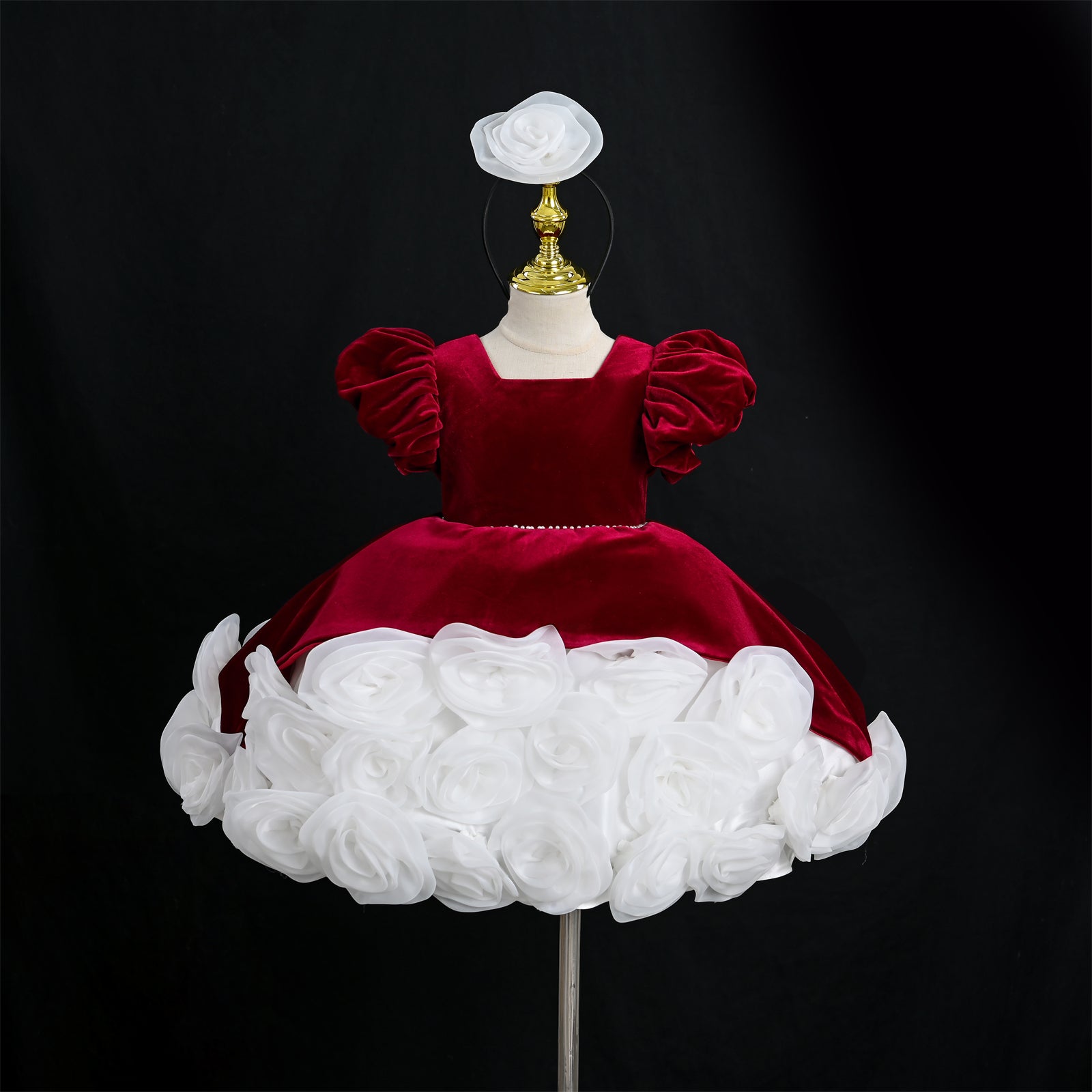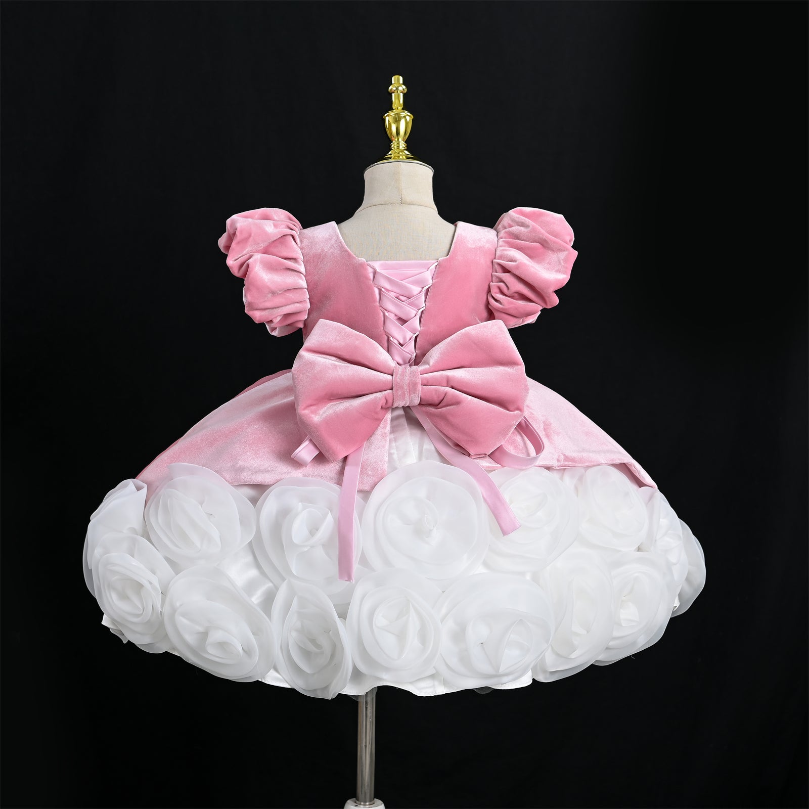 This beautiful flower girl dress combines soft velvet fabric with elegant 3D rose decorations, creating a luxurious and charming princess look for little girls. The rich velvet bodice paired with a dramatic rose flower skirt makes this dress perfect for weddings and special occasions.